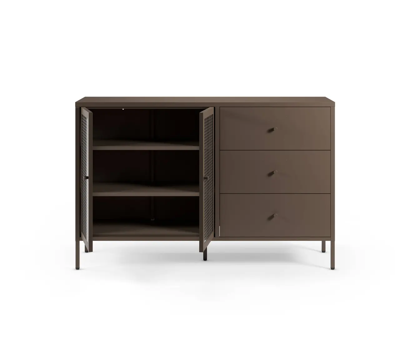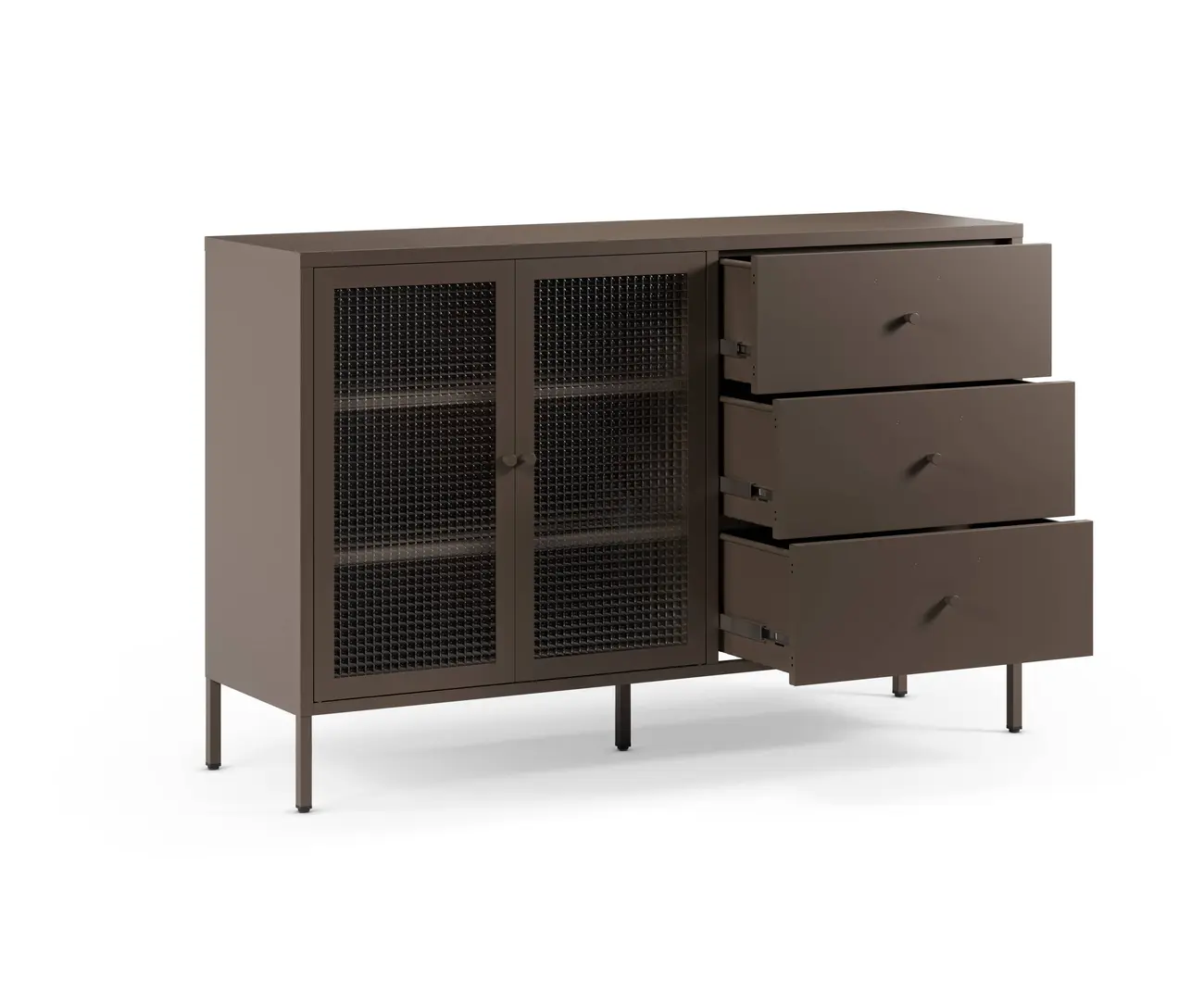 El aparador LUNA 2P3C combina metal y cristal templado en un diseño de 140 cm de largo. Incluye dos puertas con cristal templado que protegen tus objetos del polvo y tres cajones amplios para maximizar el almacenamiento. Su estructura metálica aporta un toque industrial moderno a cualquier espacio.