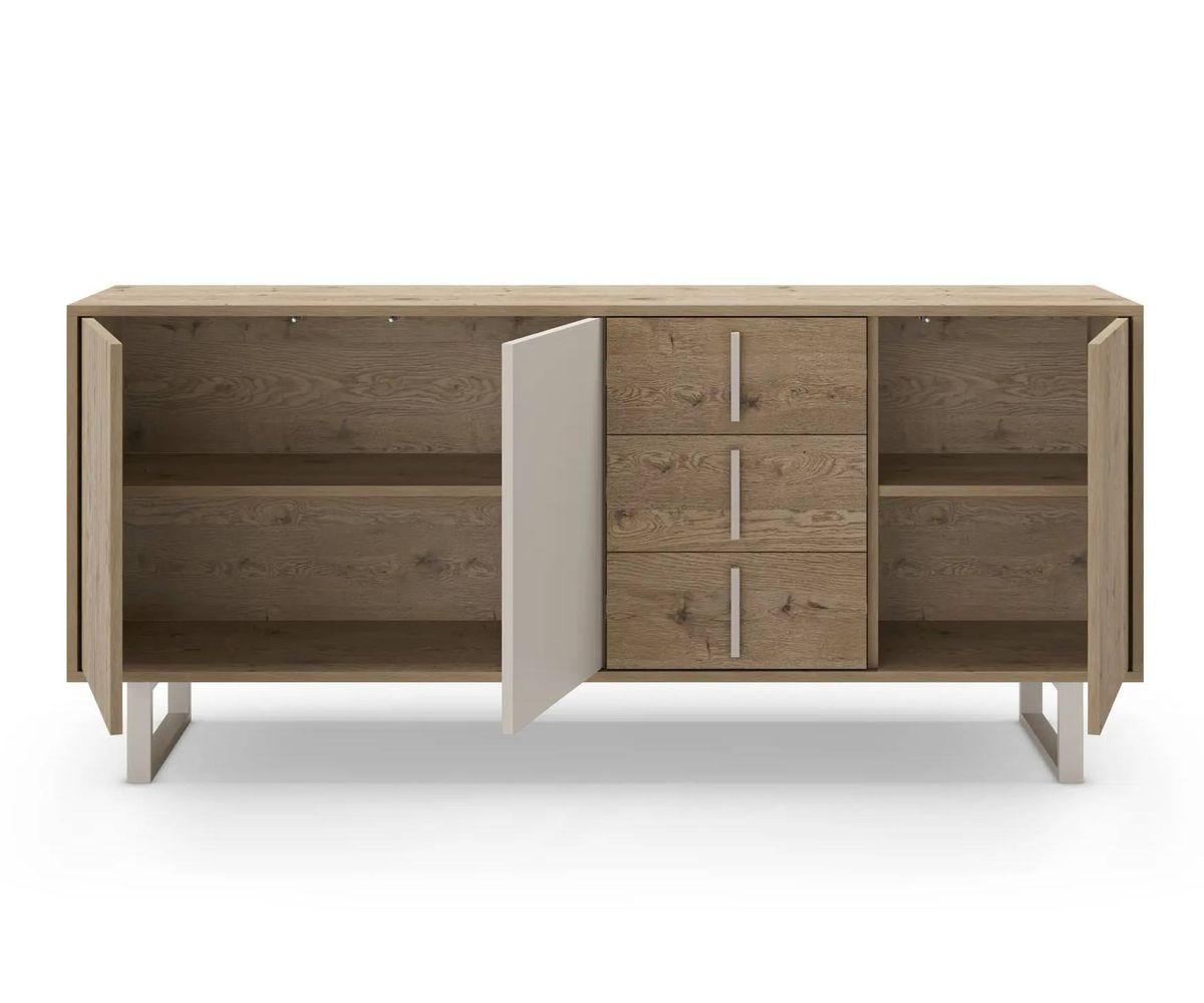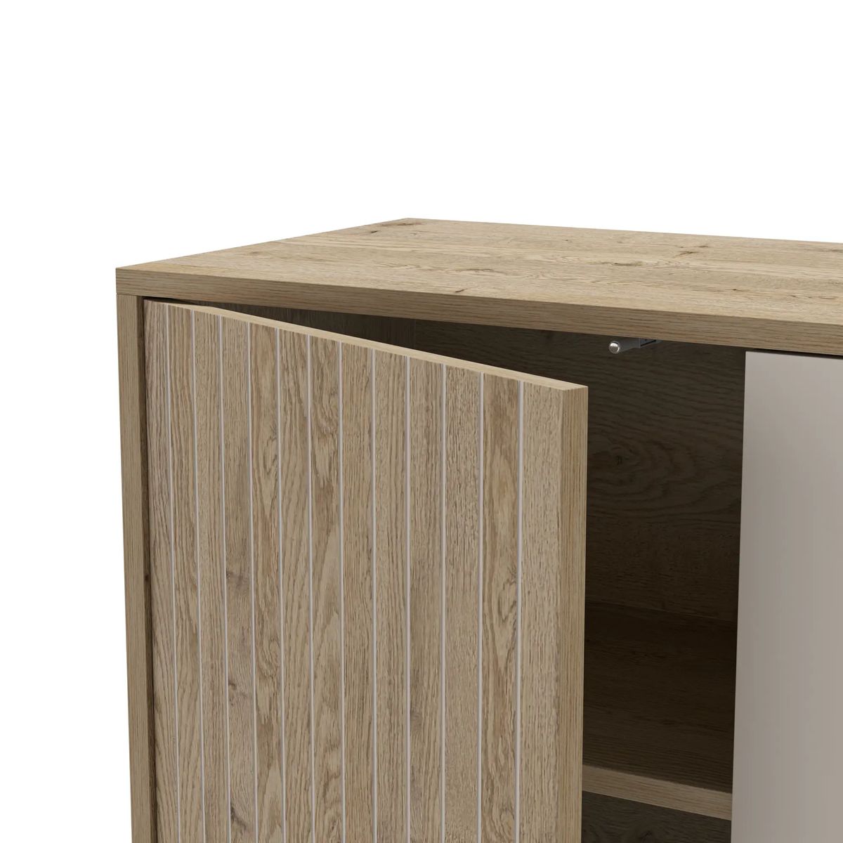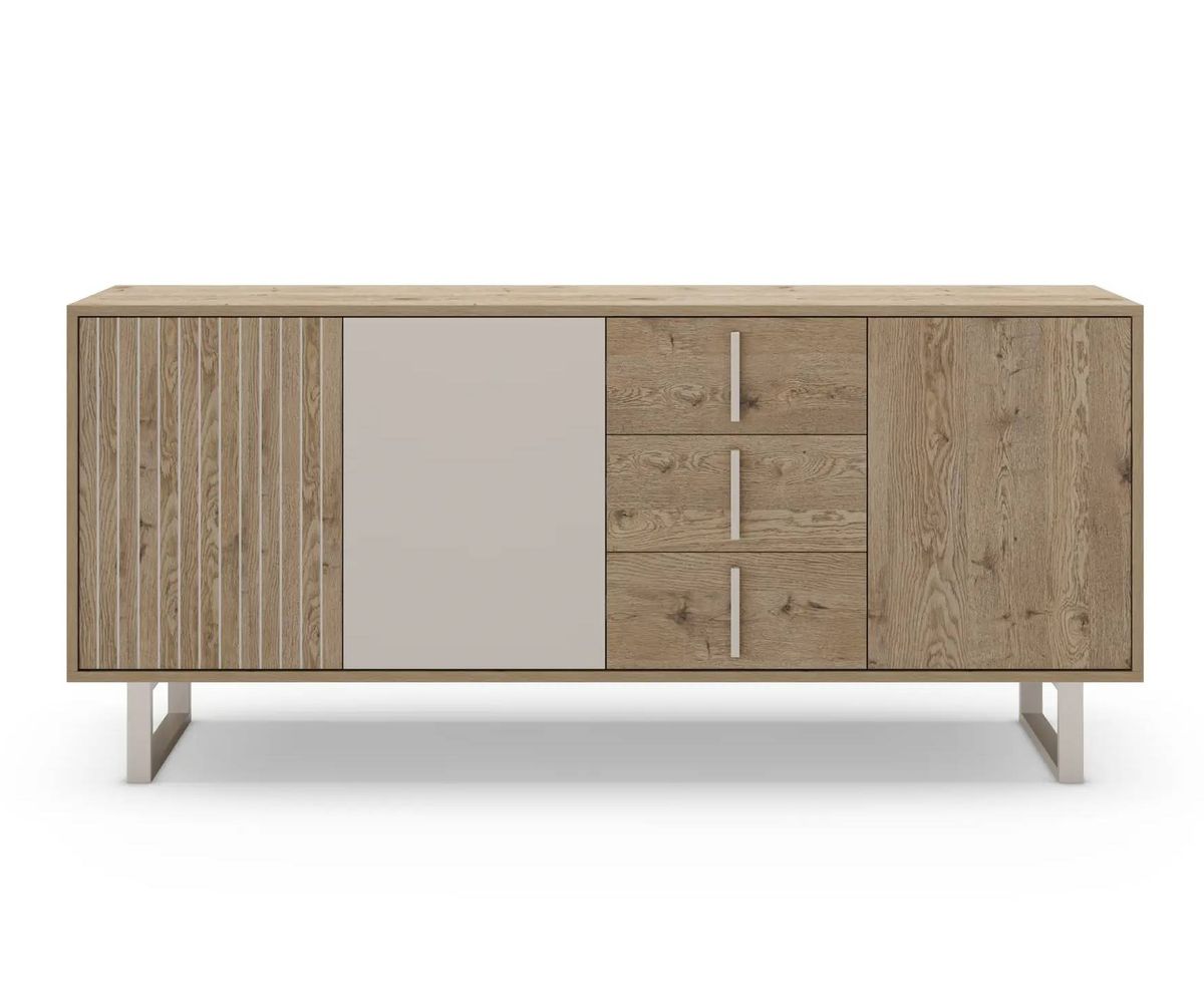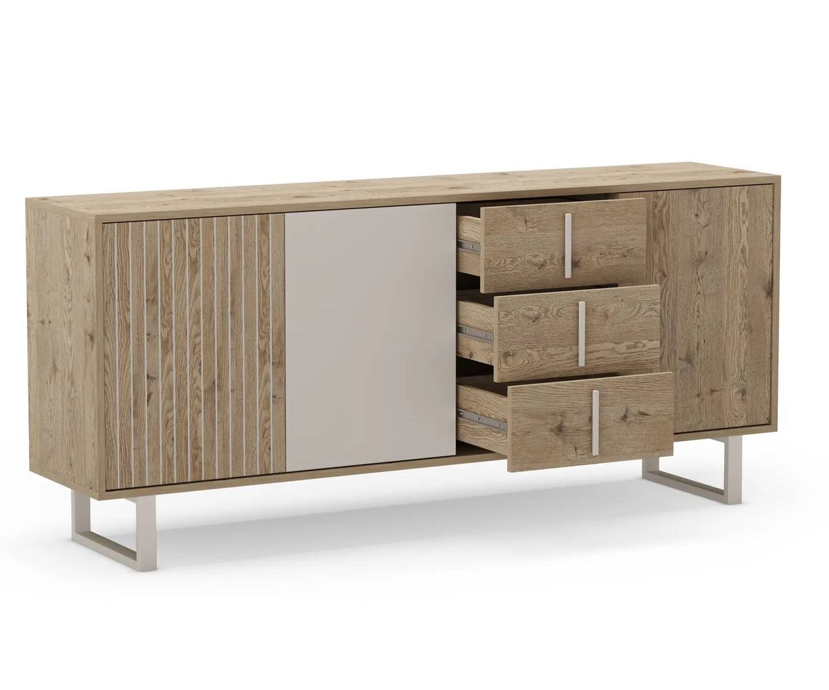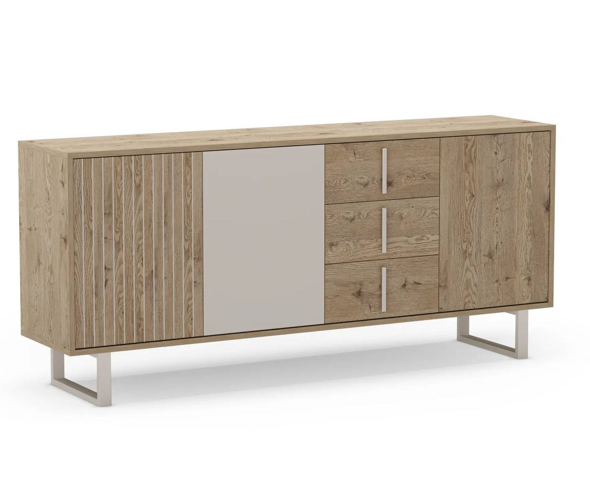 El aparador Millay de 180 cm combina madera acanalada con patas metálicas. Sus 3 puertas y 3 cajones te dan espacio suficiente para organizar lo que necesites, mientras que el acabado roble/gris se adapta bien a espacios modernos.