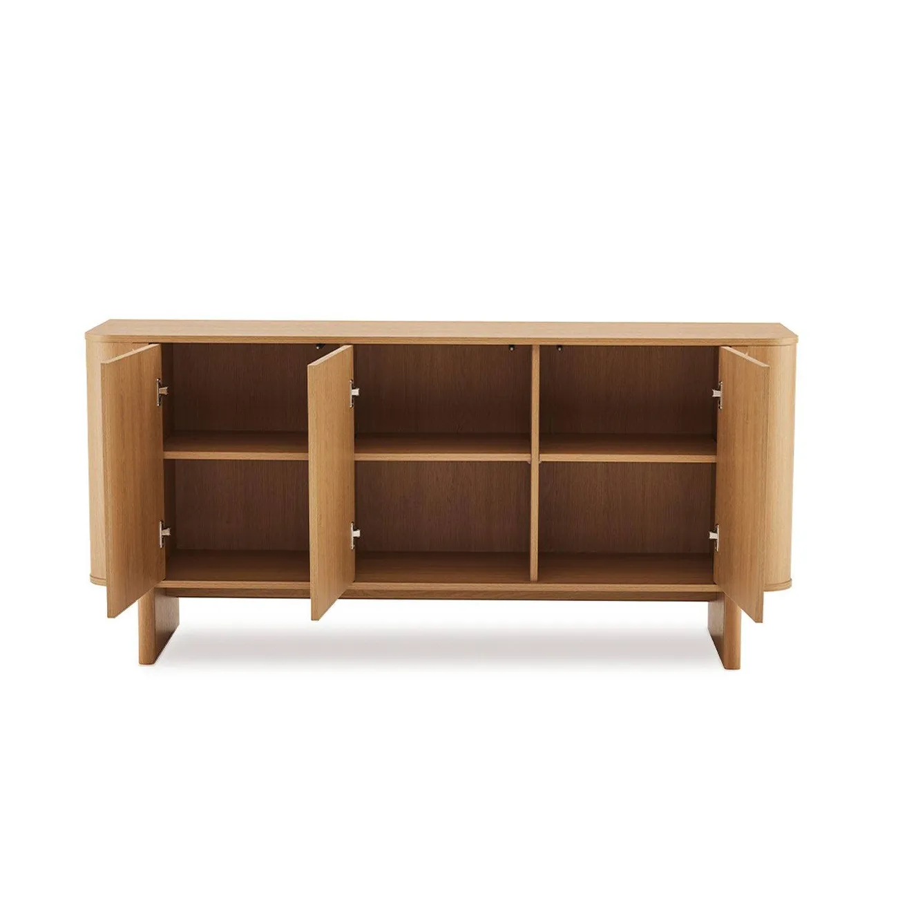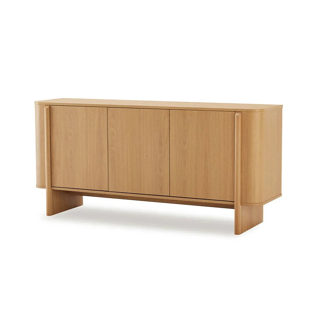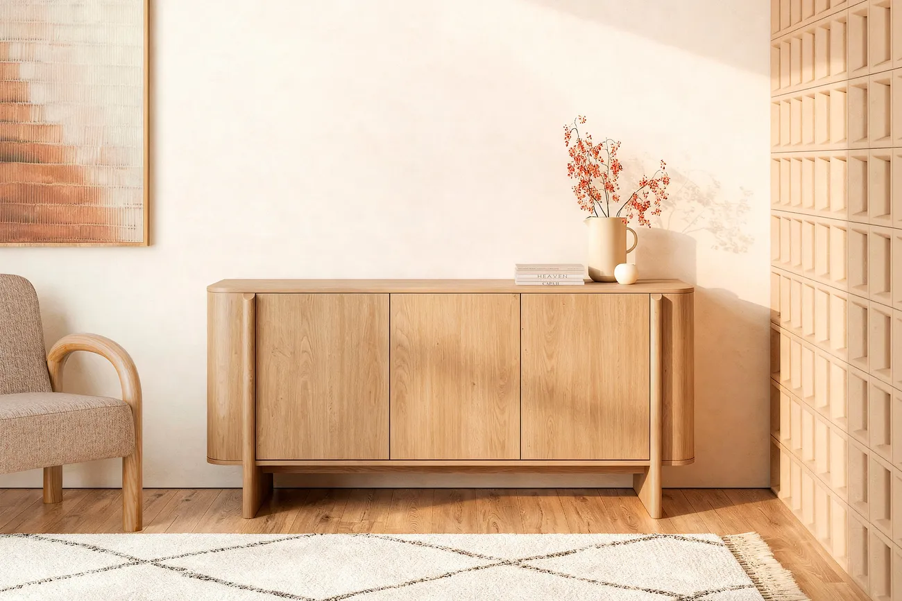 El aparador SIDNEY 160 es ese mueble que resuelve el almacenaje del salón o el comedor sin renunciar a una estética cuidada. Con tres puertas de apertura push (sin tiradores visibles), mantiene un frente limpio que encaja en ambientes modernos, nórdicos o contemporáneos. Su acabado en melamina con veta natural de madera aporta calidez a la estancia.