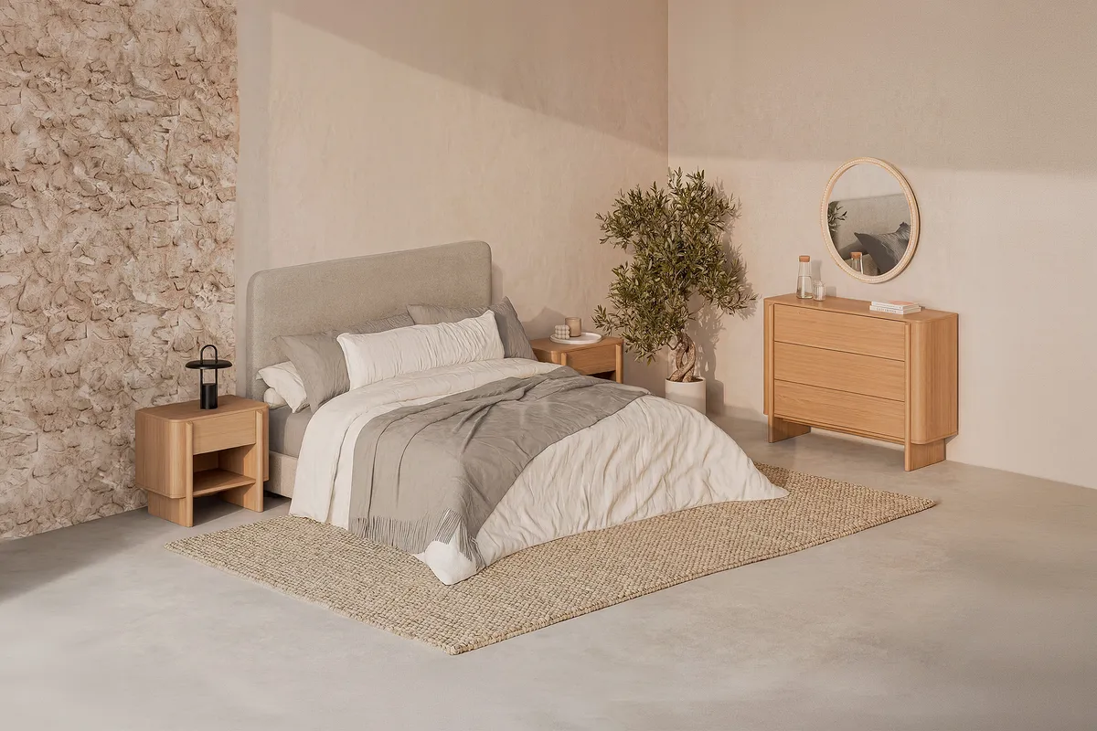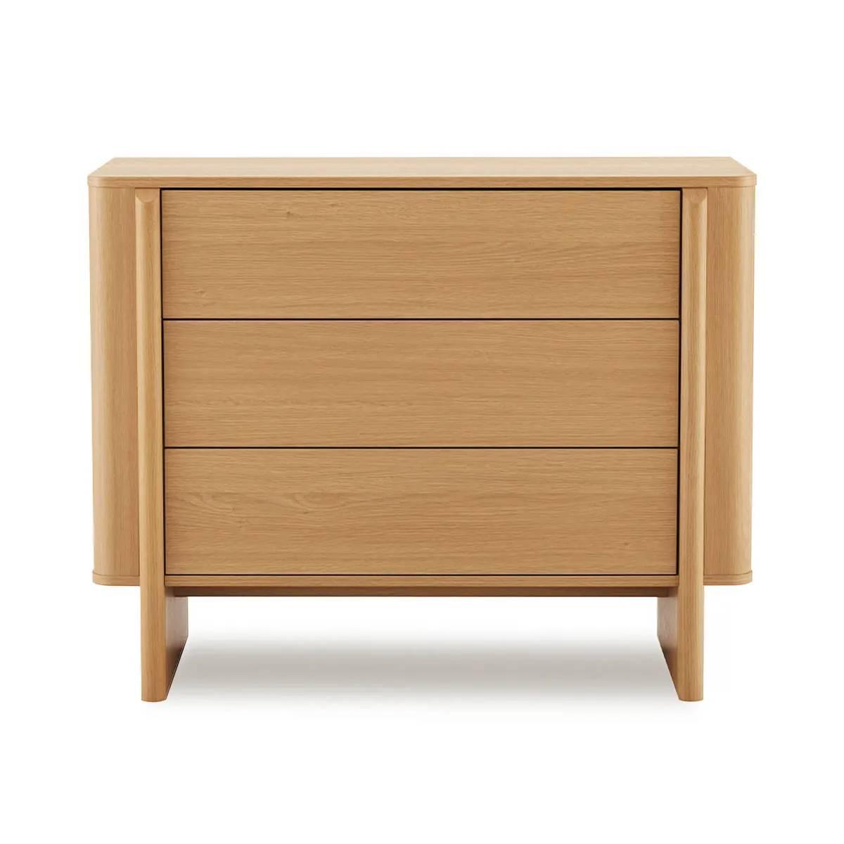 La cómoda SIDNEY cuenta con tres cajones amplios con sistema de apertura push, lo que significa que no tiene tiradores: basta con presionar para abrir. Está fabricada en melamina con acabado de veta natural que aporta un toque cálido al dormitorio. Sus medidas son 100 cm de ancho, 80 cm de alto y 42 cm de fondo, un tamaño compacto pero con buena capacidad de almacenaje.