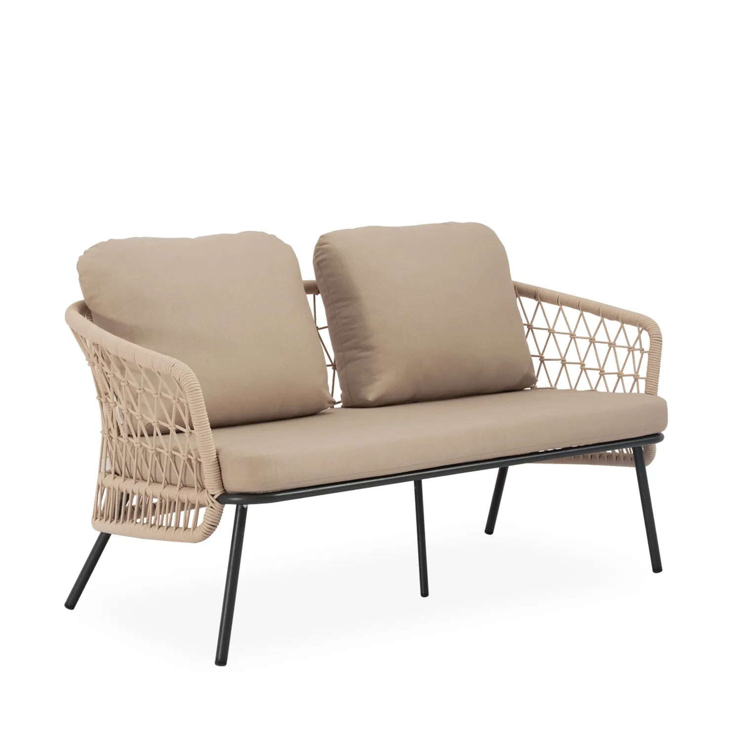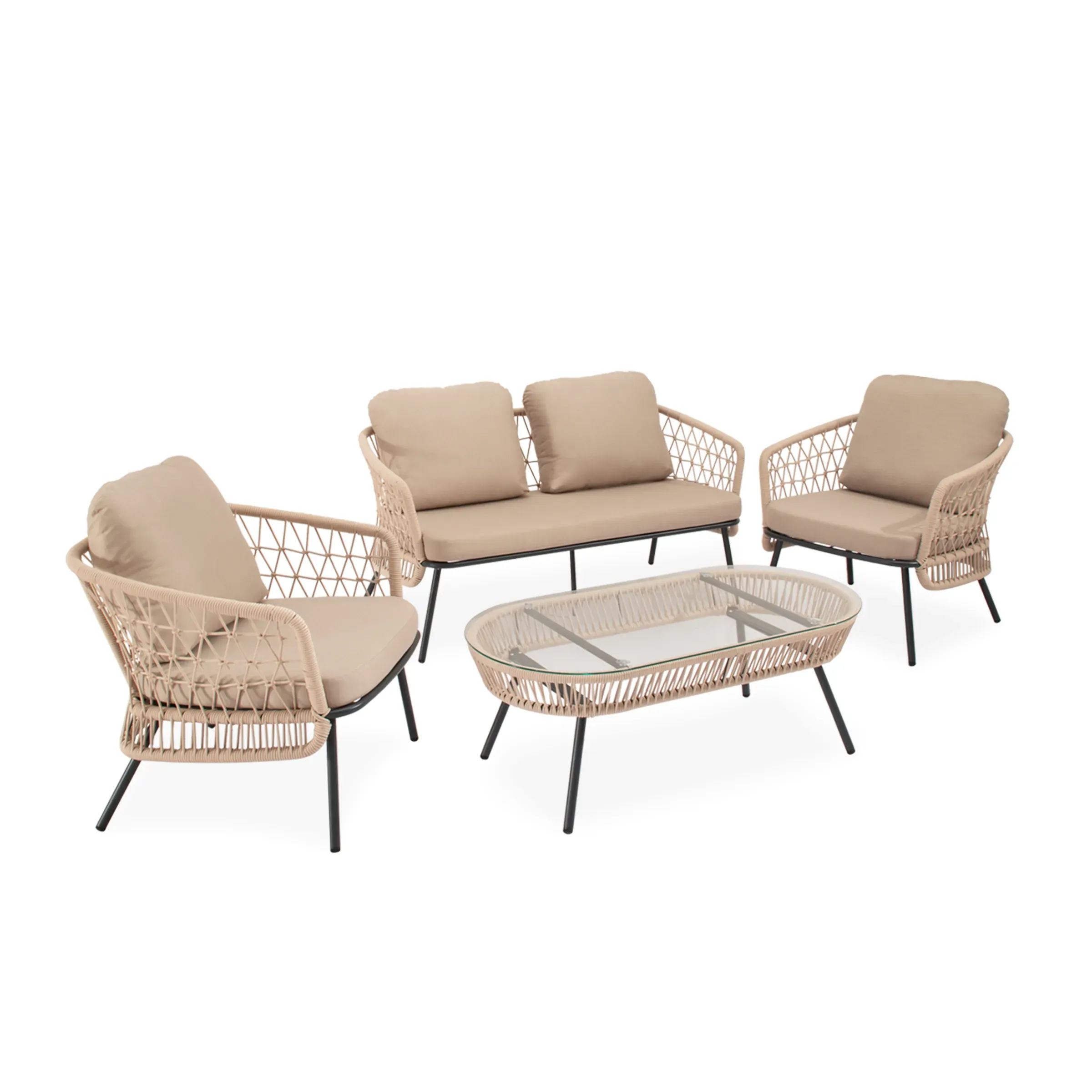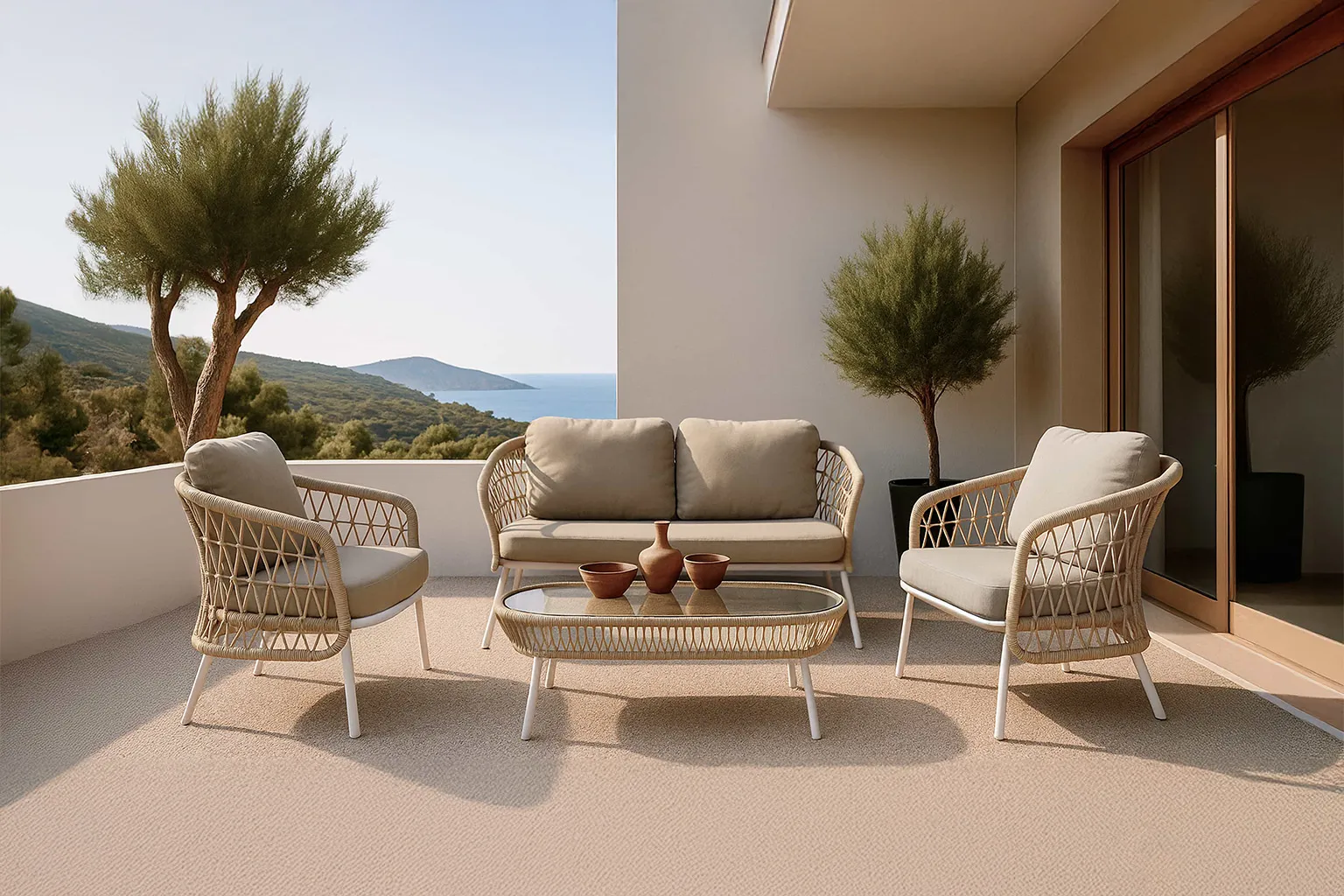 El conjunto ODESA tiene una estructura de acero galvanizado entrelazada con cuerda sintética en tono beige, lo que le da un aspecto cálido y ligero muy propio del estilo mediterráneo. La mesa de centro incluye tapa de cristal templado de 5 mm. Los cojines, también en beige, están fabricados para uso exterior. Está disponible con estructura en blanco o negro, dos acabados que encajan bien con cualquier terraza o jardín.