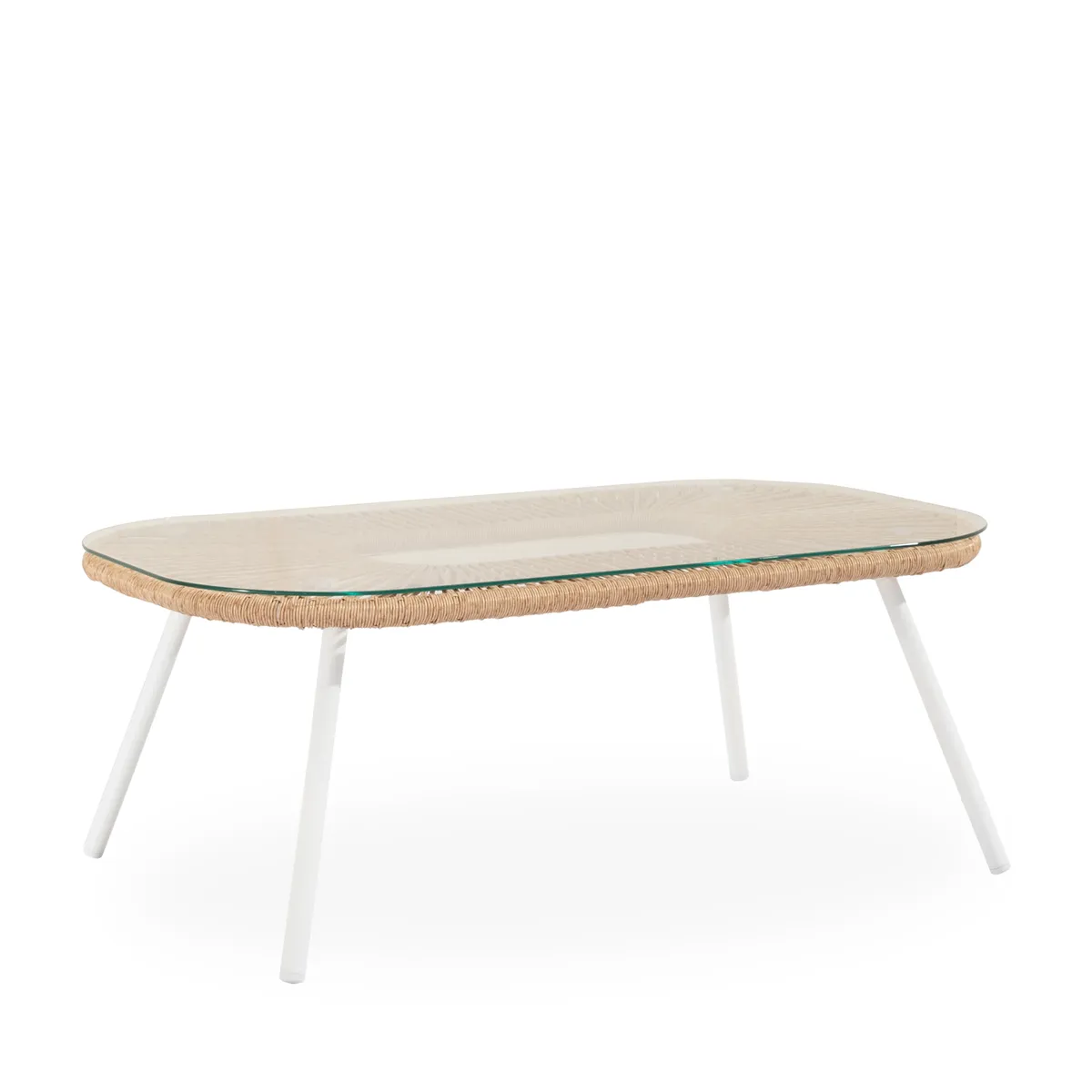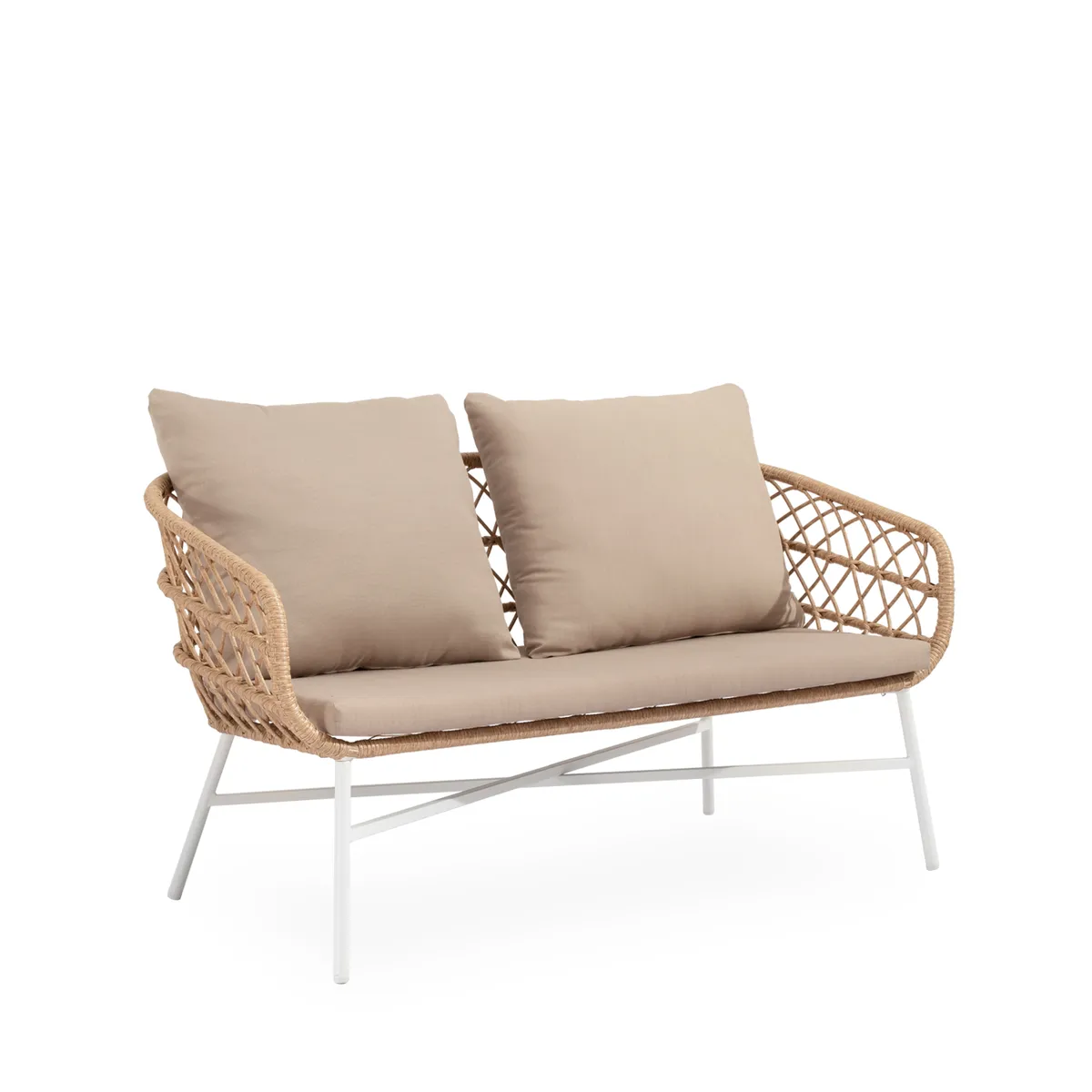 El tejido de cuerda forma un dibujo de rombos que le da al conjunto PERUGIA un aire artesanal y mediterráneo. La estructura, en acero galvanizado, se ofrece con acabado en blanco o negro, mientras que la mesa de centro incorpora tapa de cristal templado. Los cojines van en tono beige y están preparados para el uso en exterior.