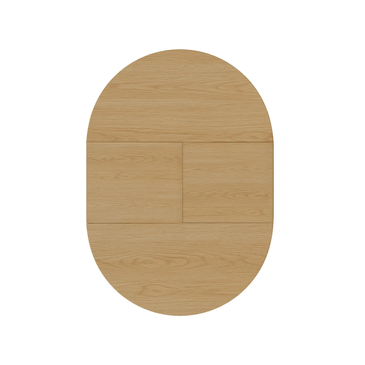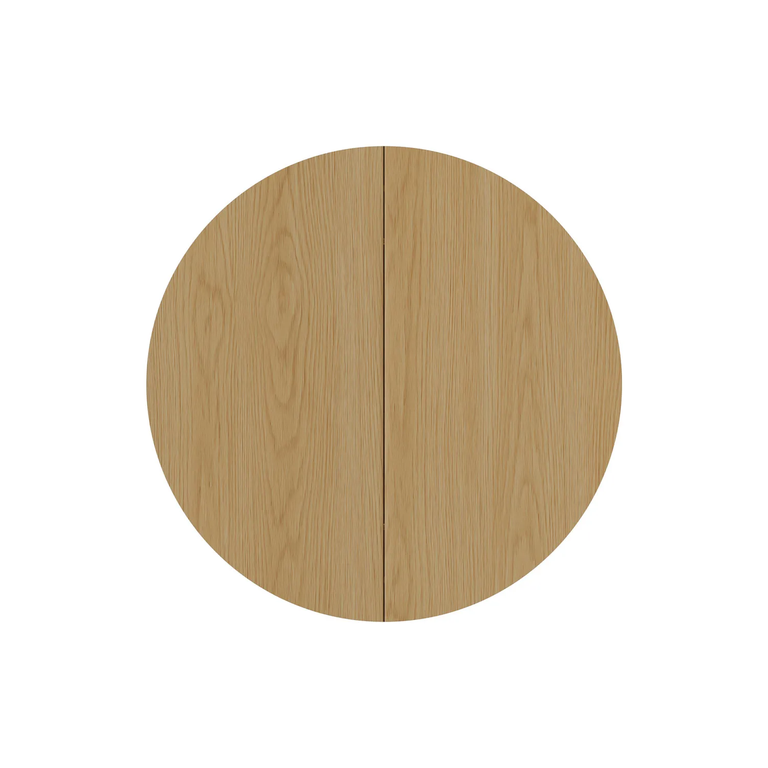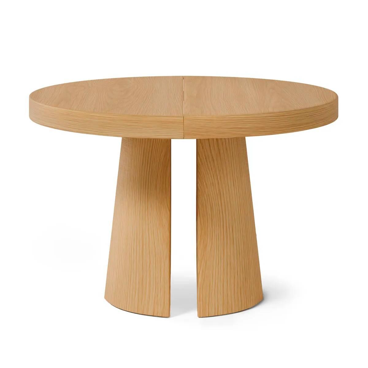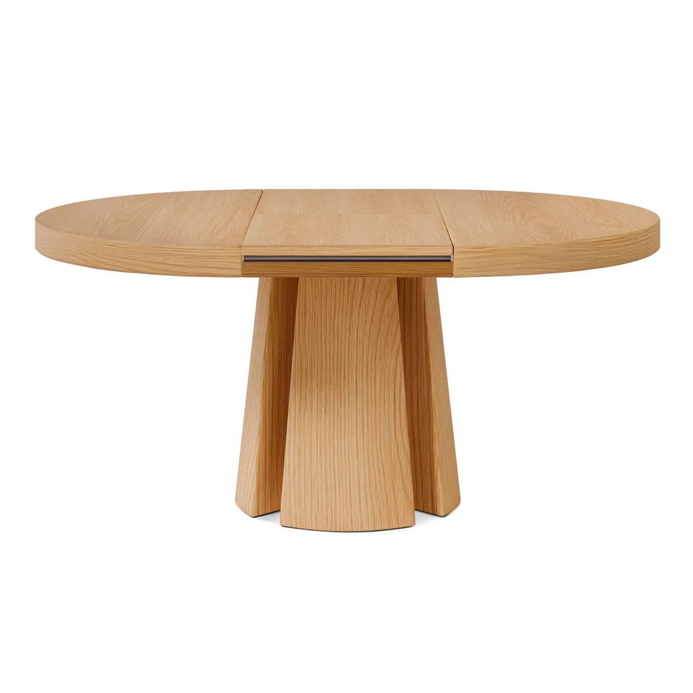 Fabricada en chapa de roble natural, tanto la tapa como la base, tiene un grosor de 8 cm que aporta presencia visual. Mide 77,5 cm de alto y la pata ocupa 62 cm en su parte más ancha. Una mesa extensible redonda que funciona muy bien en comedores de estilo nórdico, moderno o japandi donde la madera clara y las líneas limpias marcan el ambiente.