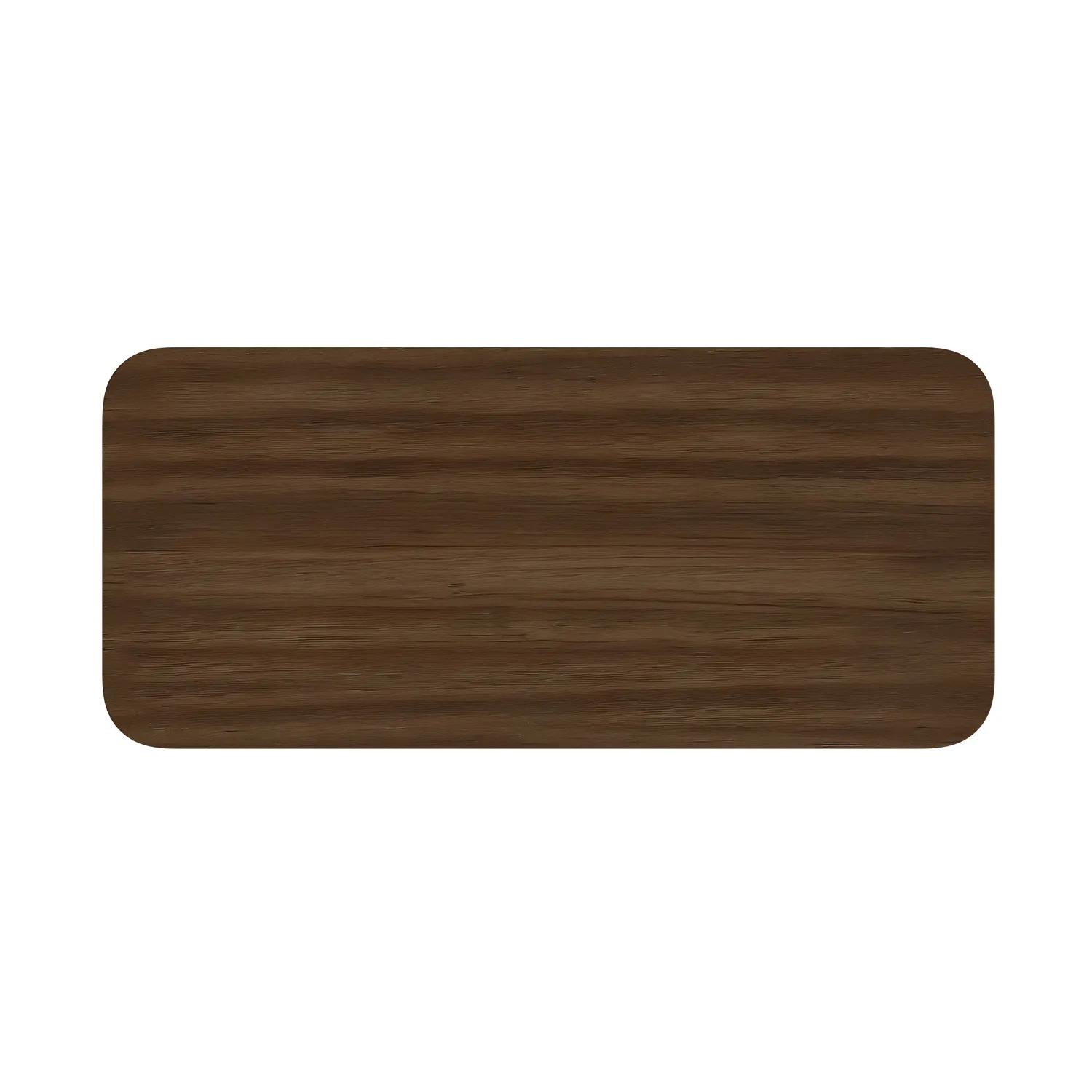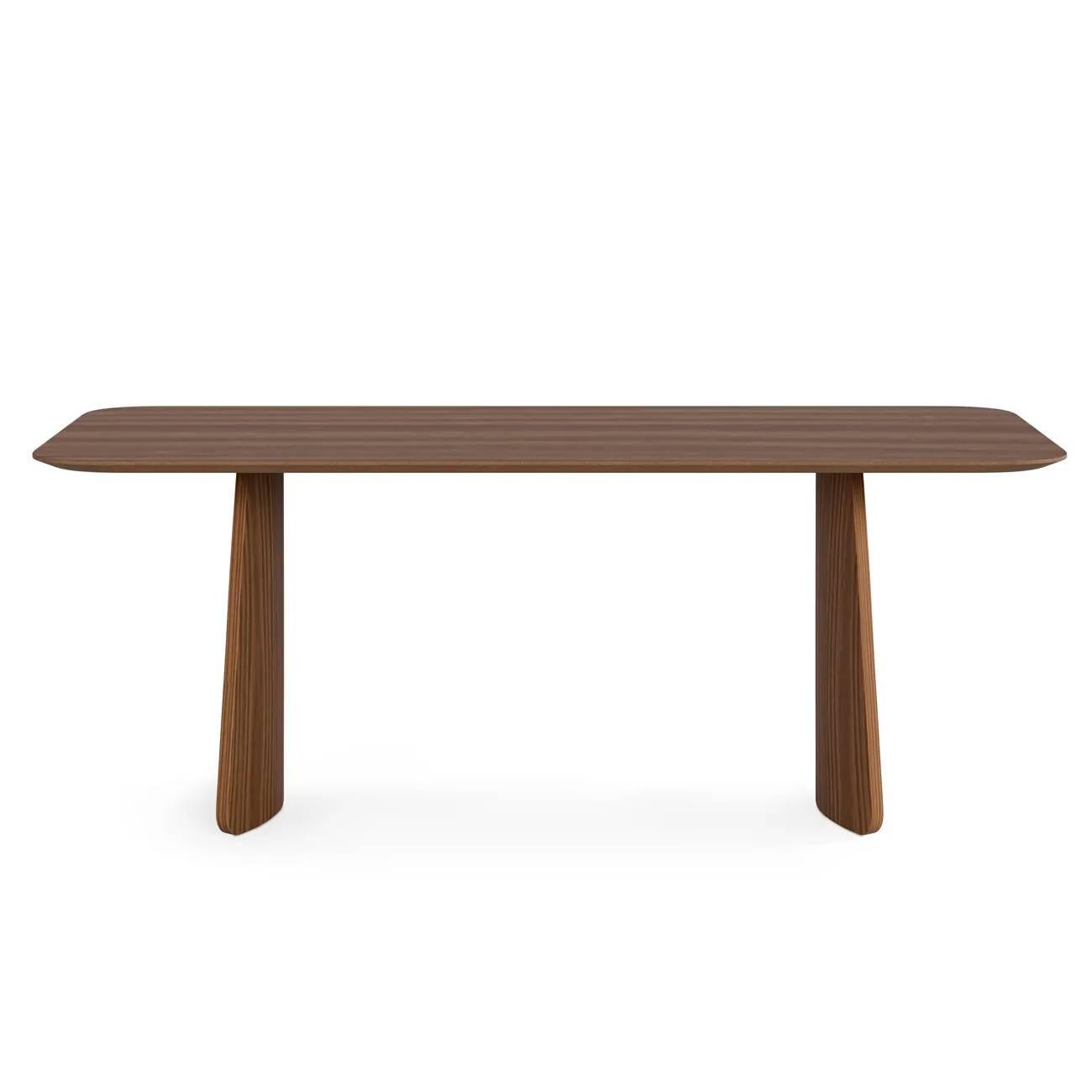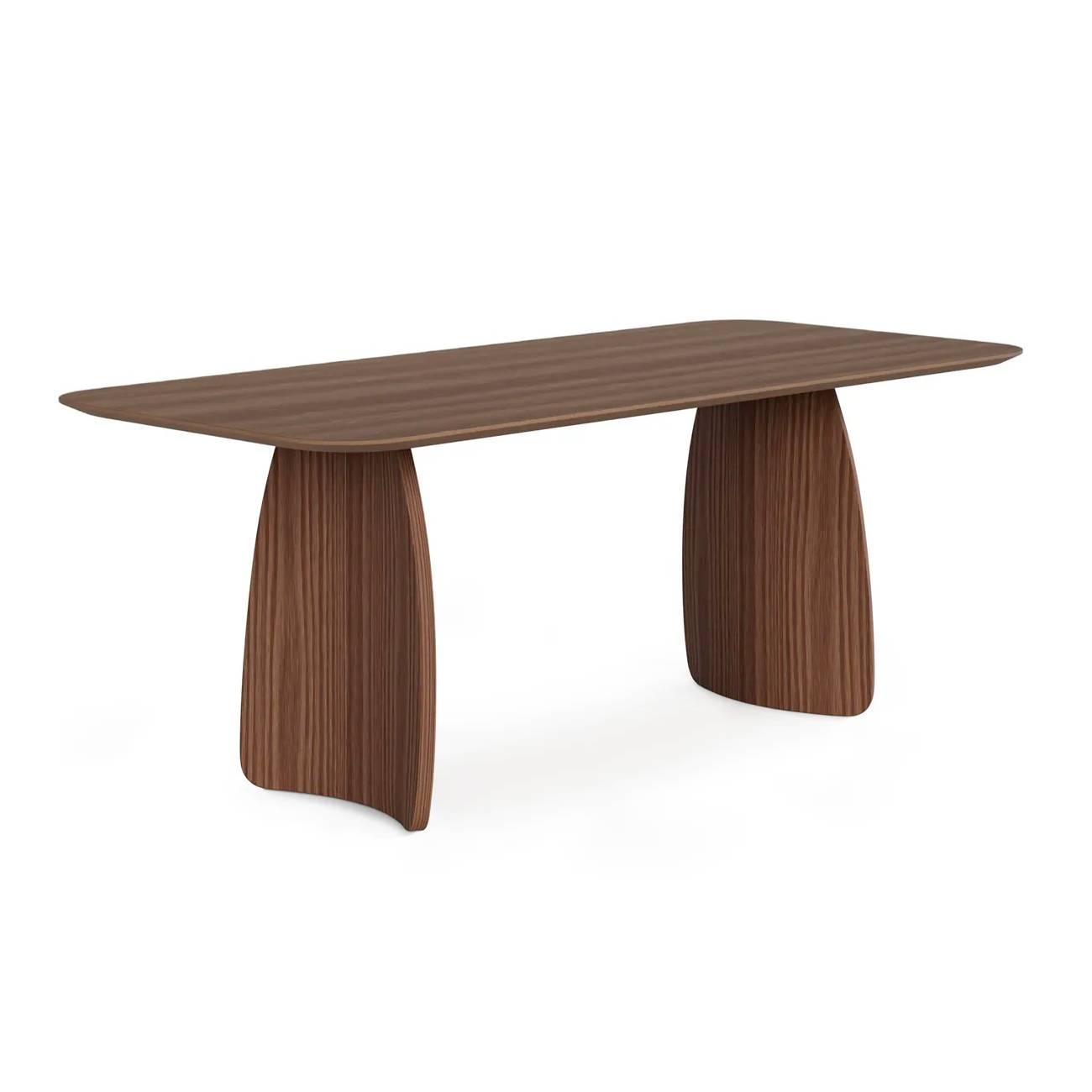 Las patas curvas de la mesa KIMBERLY son su seña de identidad: dos formas orgánicas que nacen anchas desde el suelo y se estrechan hacia la tapa, creando un efecto escultórico que no pasa desapercibido. Toda la mesa está fabricada en chapa de madera con acabado nogal, un tono cálido y oscuro que encaja en comedores modernos.
