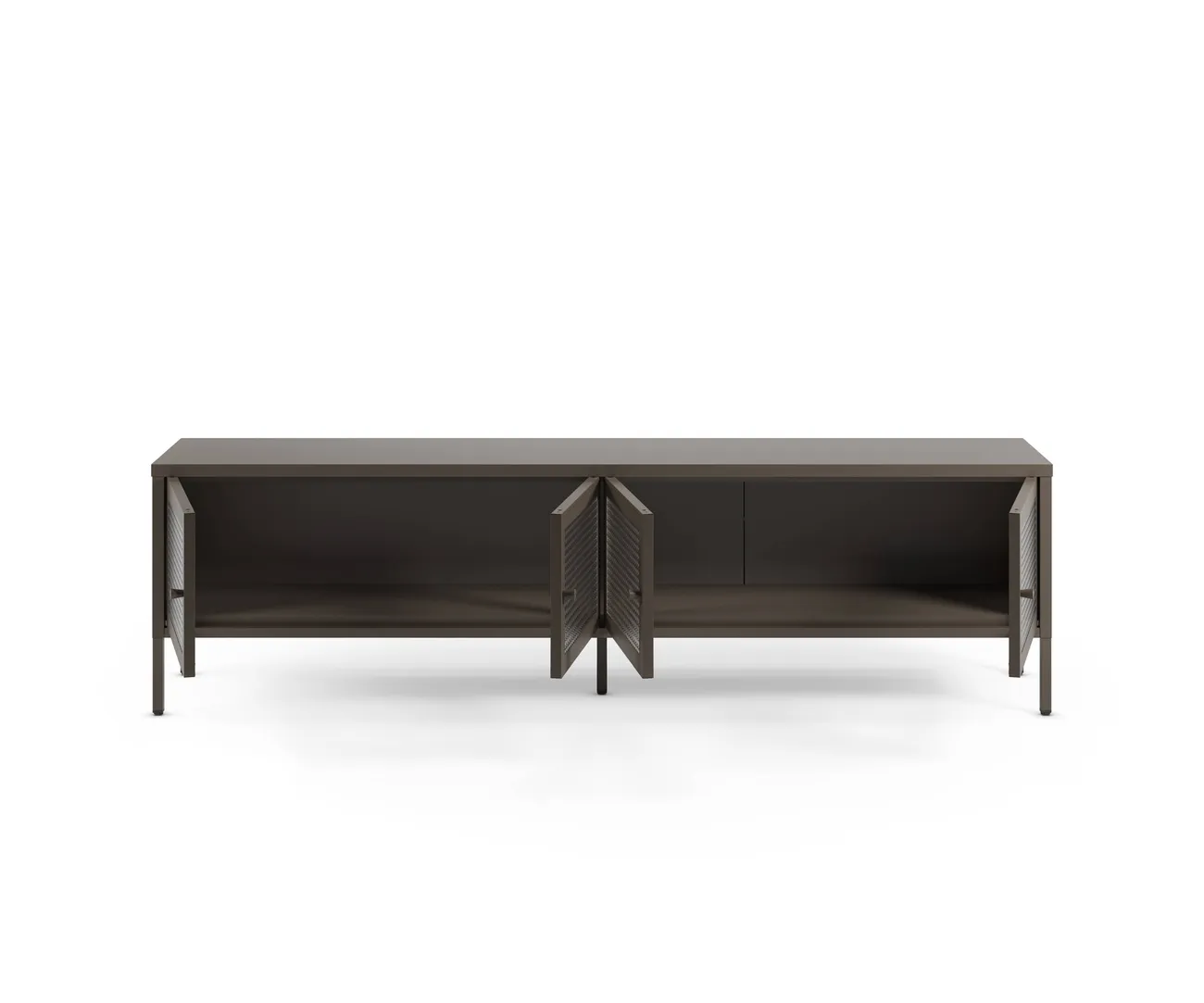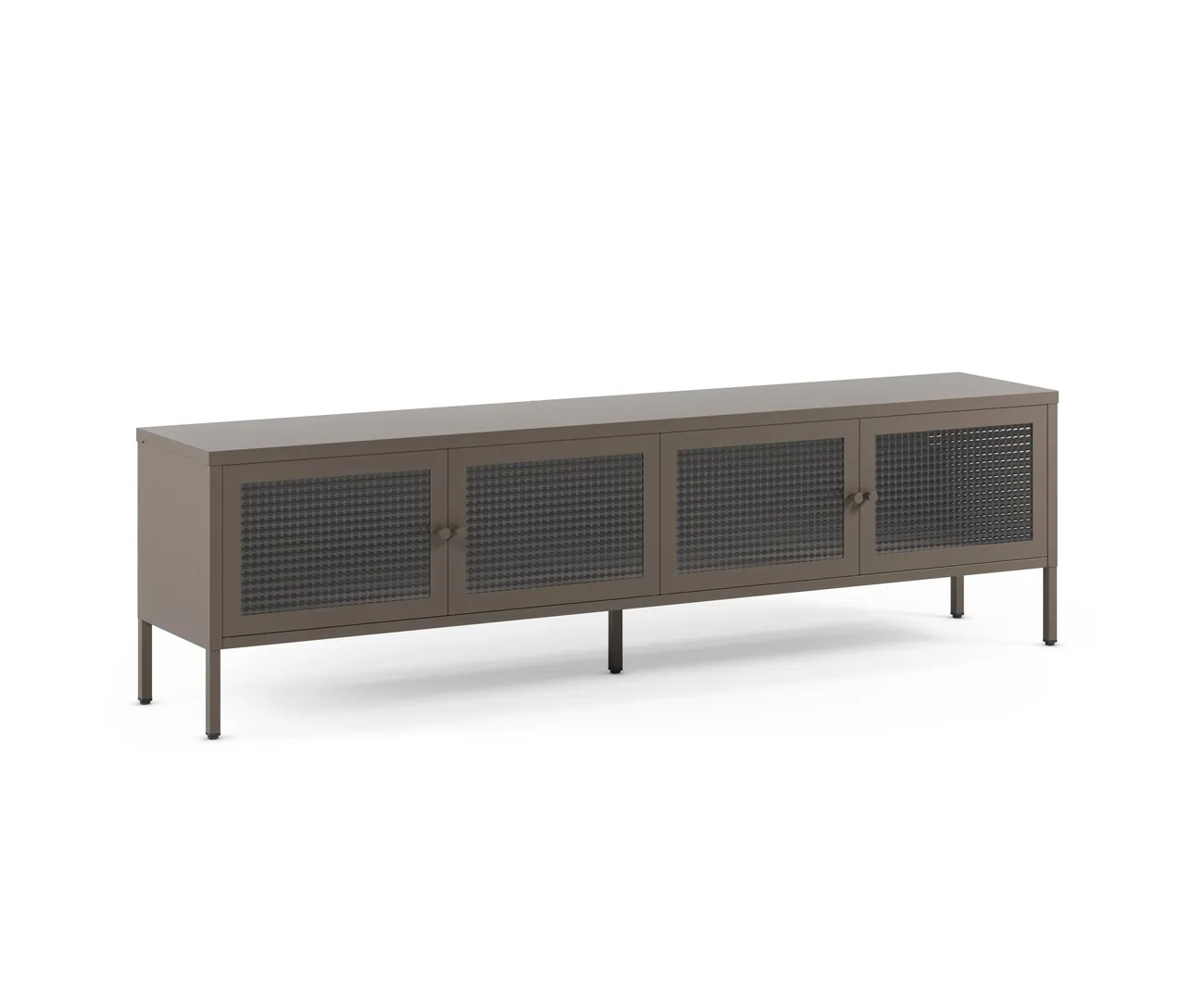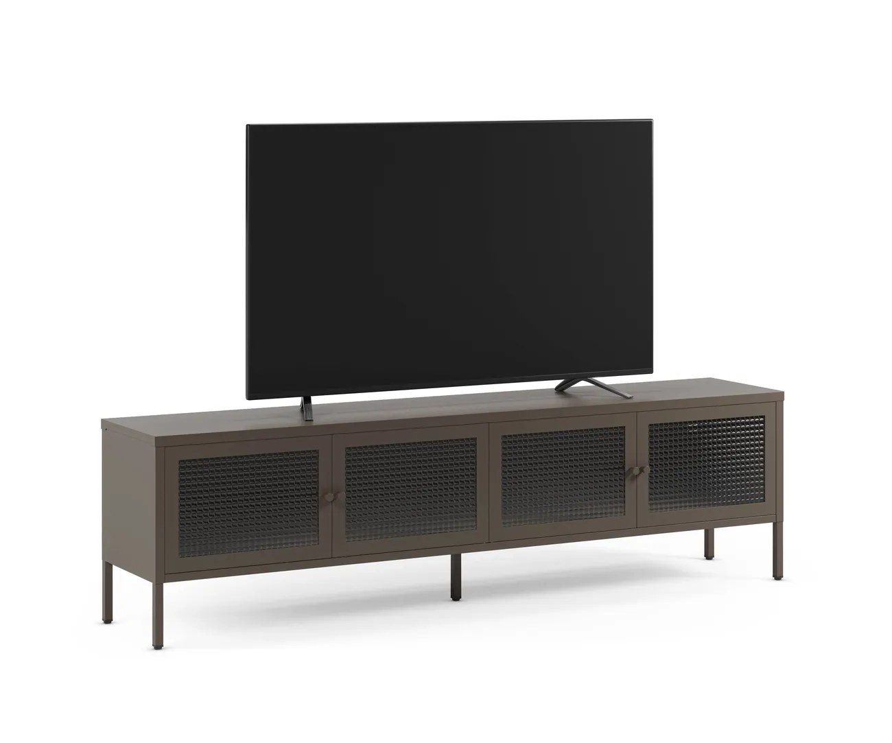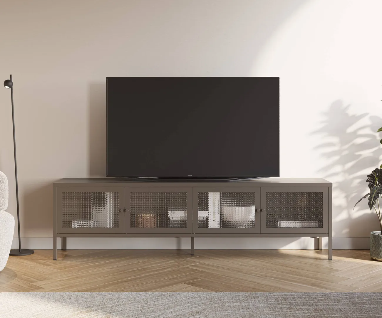 Disponible en acabado moca, este mueble TV combina funcionalidad con diseño industrial moderno. Se integra perfectamente en salones contemporáneos que necesitan orden y estilo sin renunciar a la capacidad de almacenamiento.