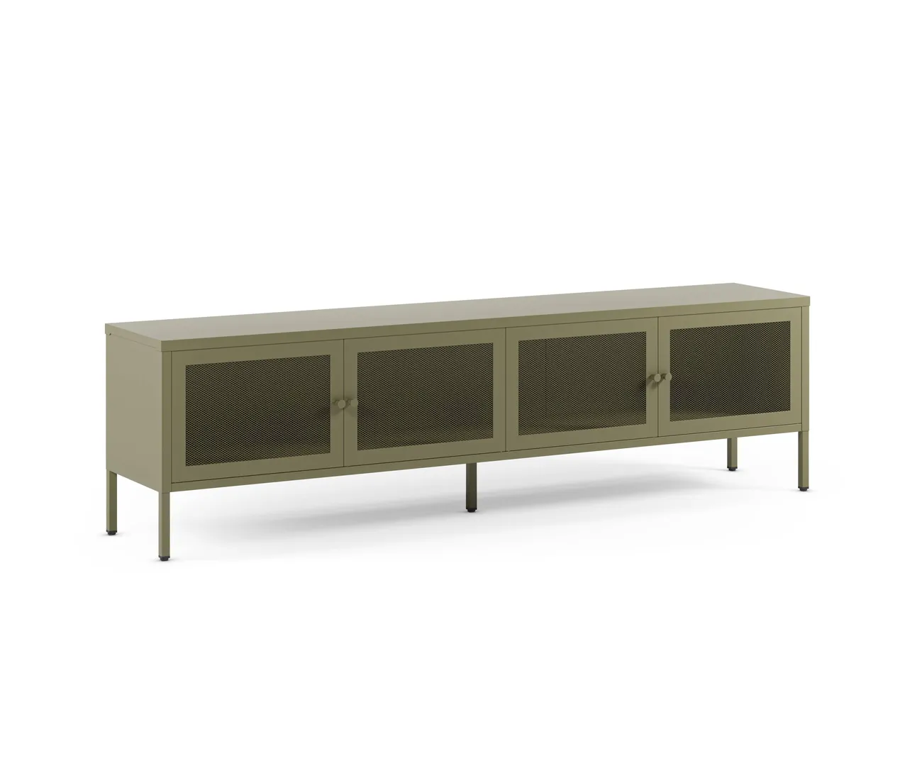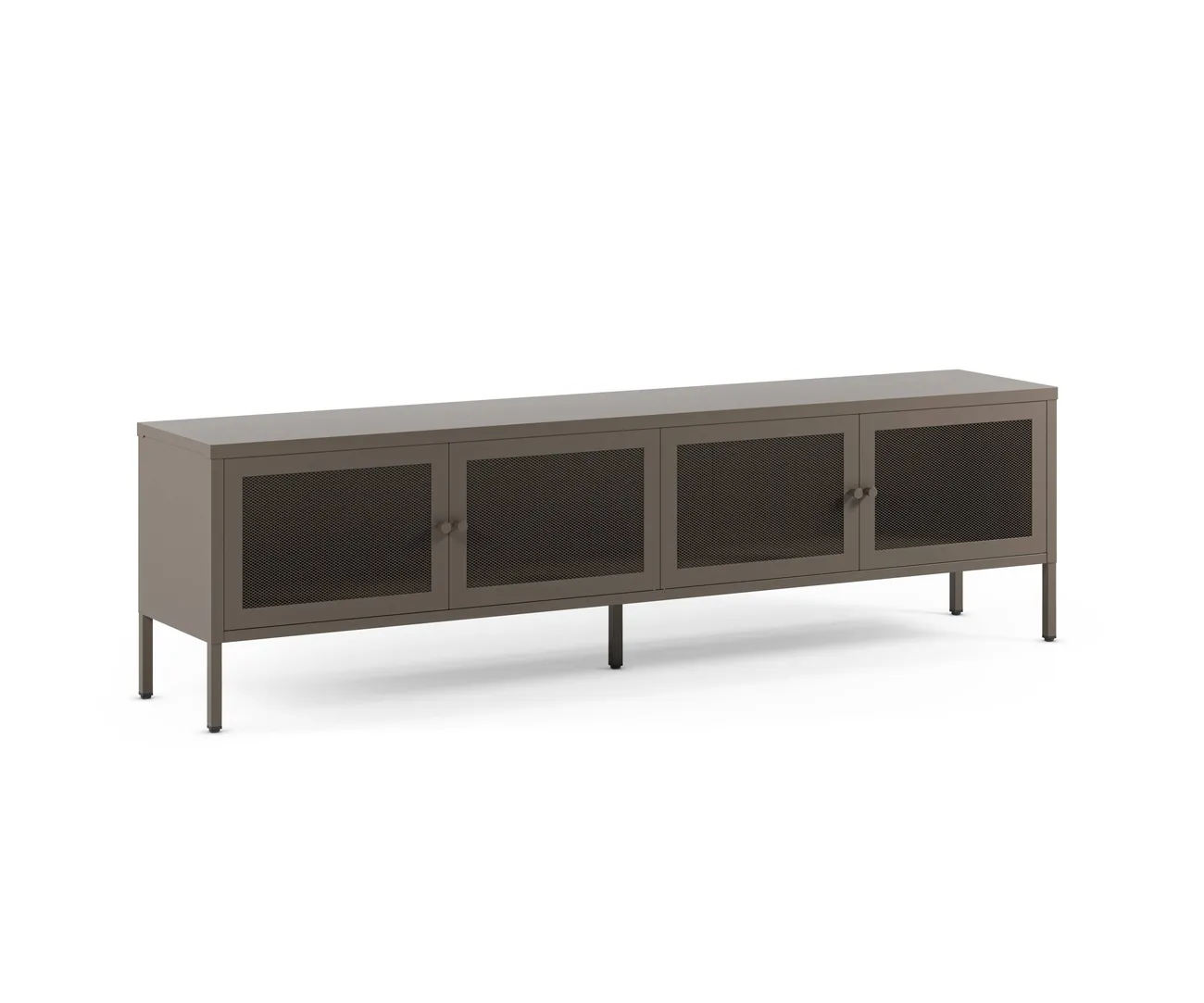 El mueble TV TANA 4P mide 160 cm de largo, 35 cm de ancho y 50 cm de alto. Sus cuatro puertas de rejilla metálica proporcionan amplio espacio de almacenamiento manteniendo un estilo industrial moderno. Es perfecto para televisores grandes y organizar todos los dispositivos audiovisuales.