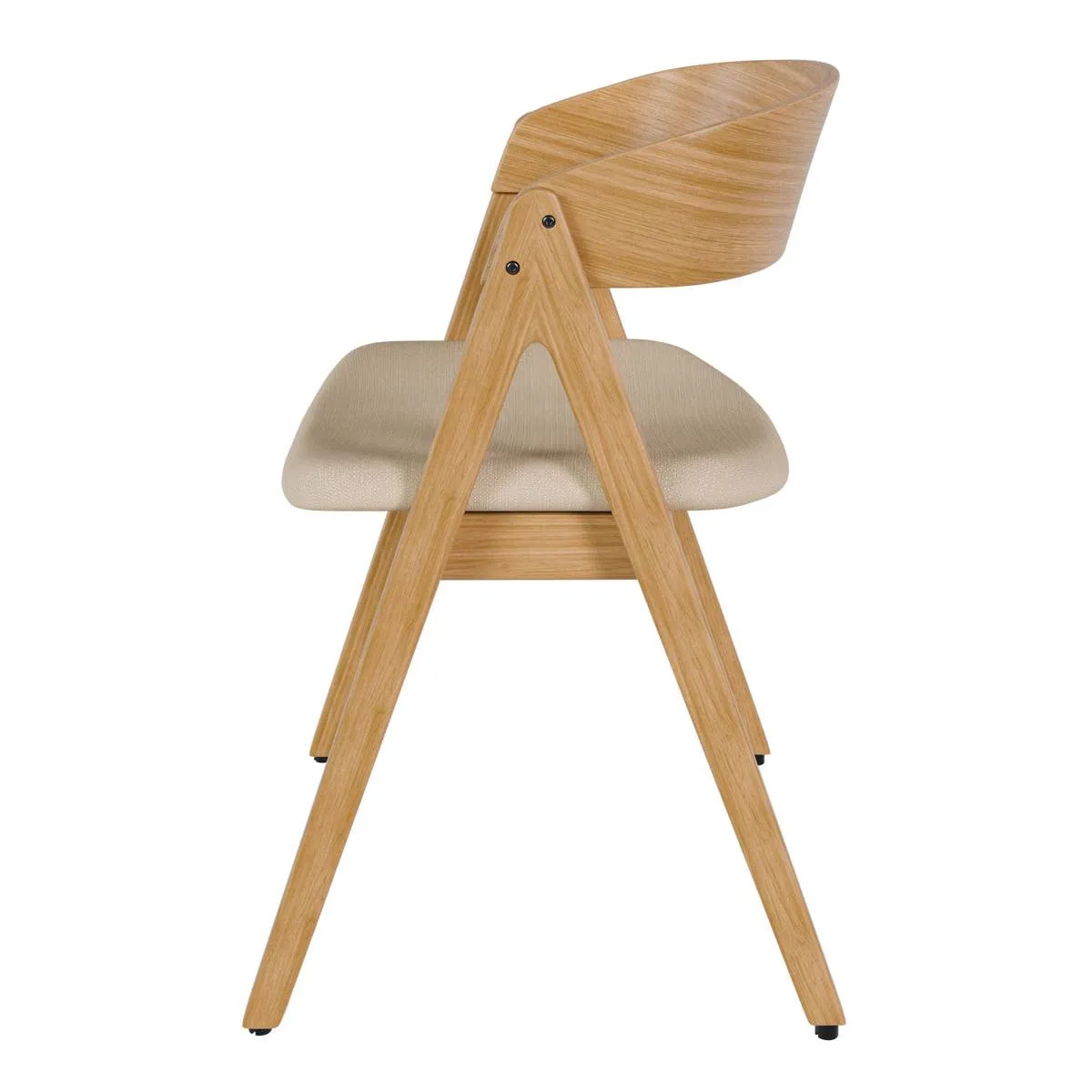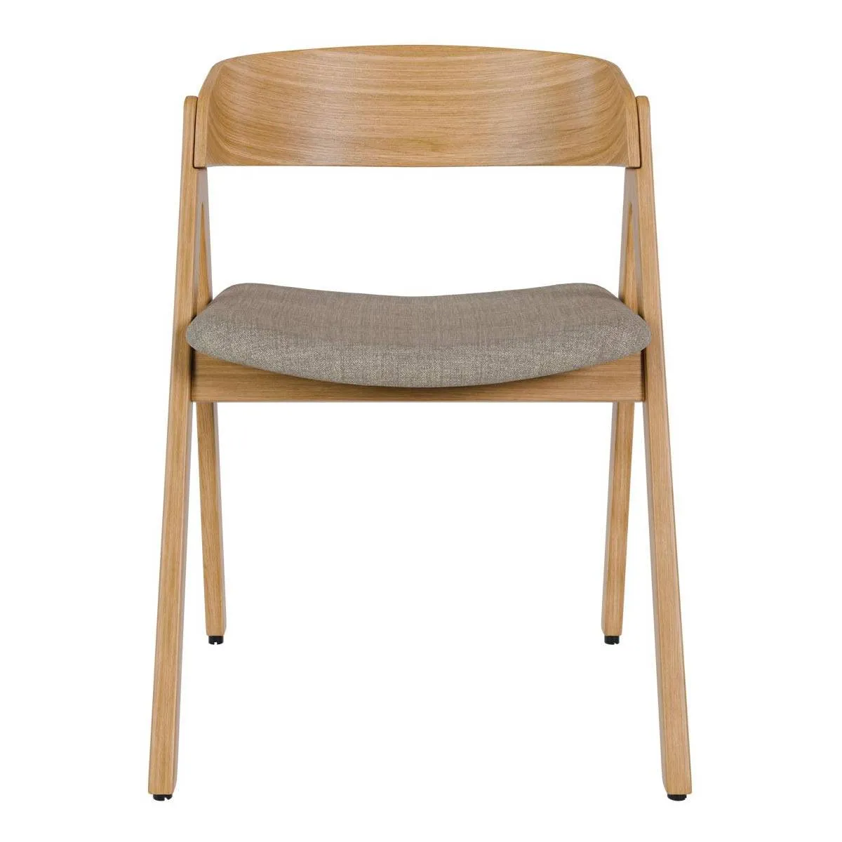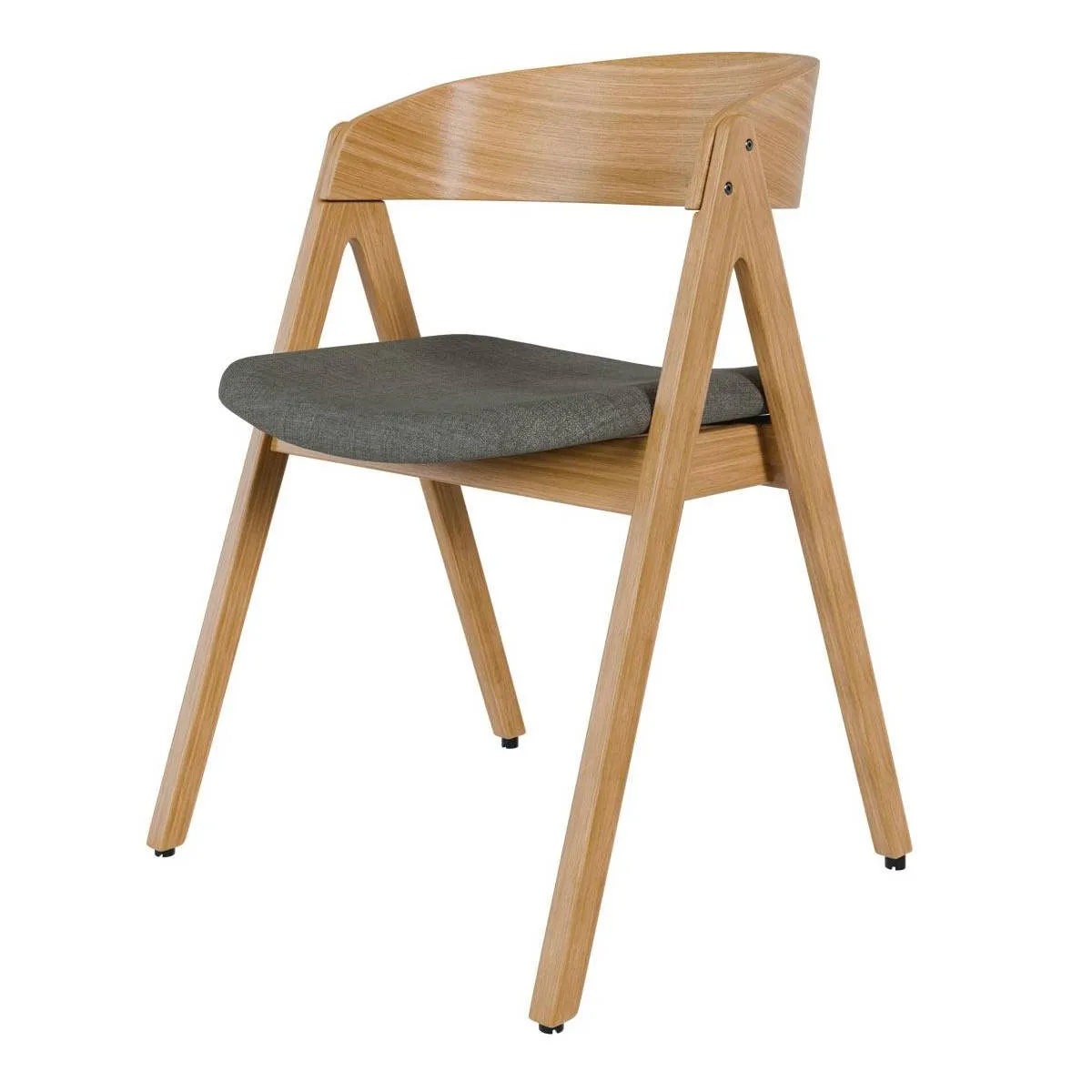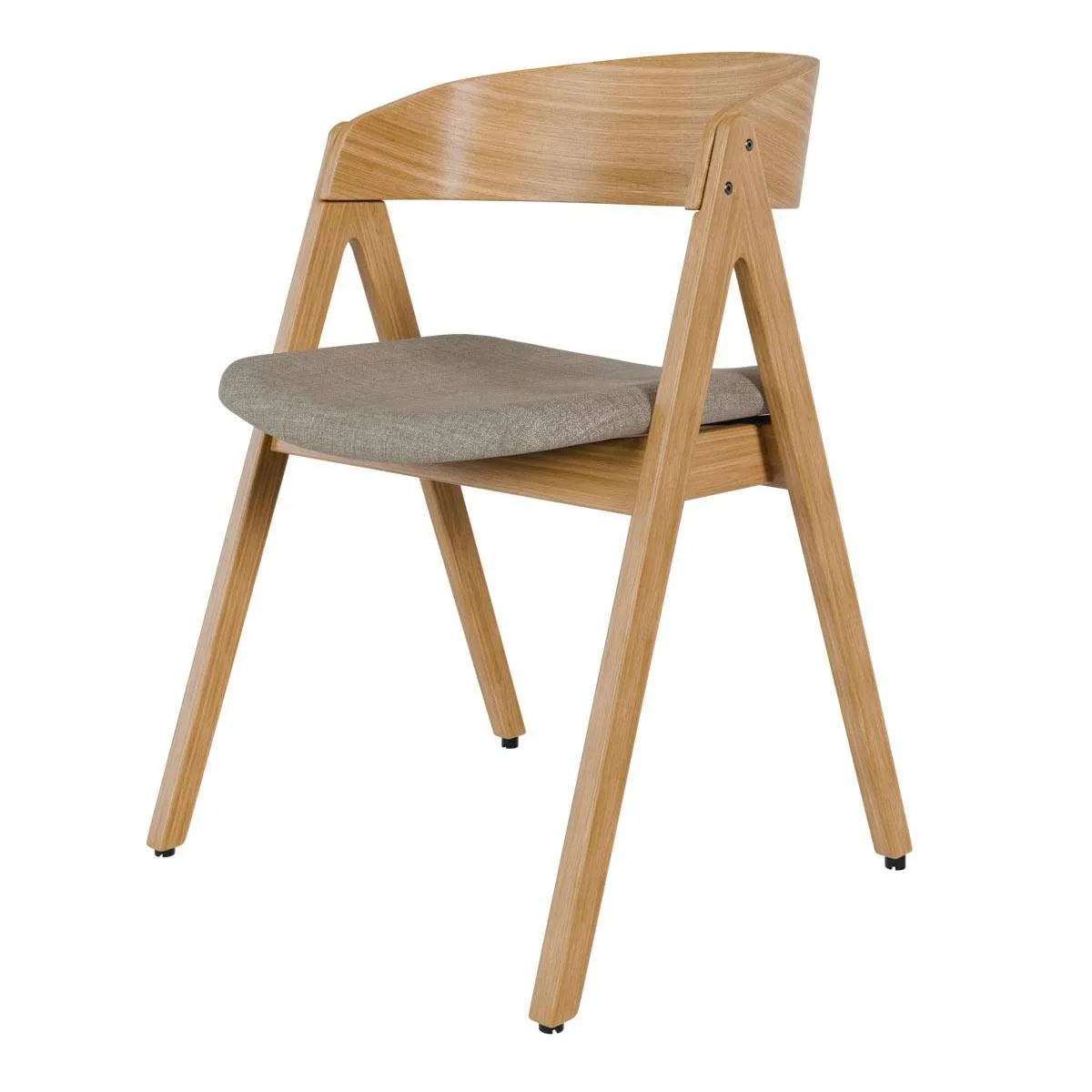 El tono claro de la madera de hevea en acabado roble hace que la silla RINA encaje muy bien en comedores luminosos y ambientes de estilo nórdico. Su silueta con respaldo curvado y patas en ángulo le da un aire actual sin perder comodidad: el asiento tapizado en tela 100% poliéster ofrece un tacto agradable. Puedes elegir entre tres colores de tapizado: beige, gris claro y gris oscuro.