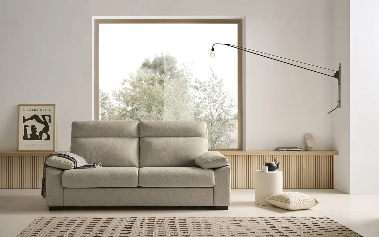 Lo que más llama la atención del sofá cama DALIA es lo cómodo que resulta como sofá: asiento firme, respaldo mullido y brazos acolchados que invitan a quedarse. Pero además, con un solo gesto se convierte en cama gracias a su mecanismo italiano, dejando un colchón acolchado de 15 cm de grosor en el que se descansa bien. Las fundas de asiento, respaldo y brazos son desenfundables, así que mantenerlo limpio es fácil. Disponible en 3 plazas (203×98 cm, cama de 140×195 cm) y 2 plazas (163×98 cm, cama de 100×190 cm).