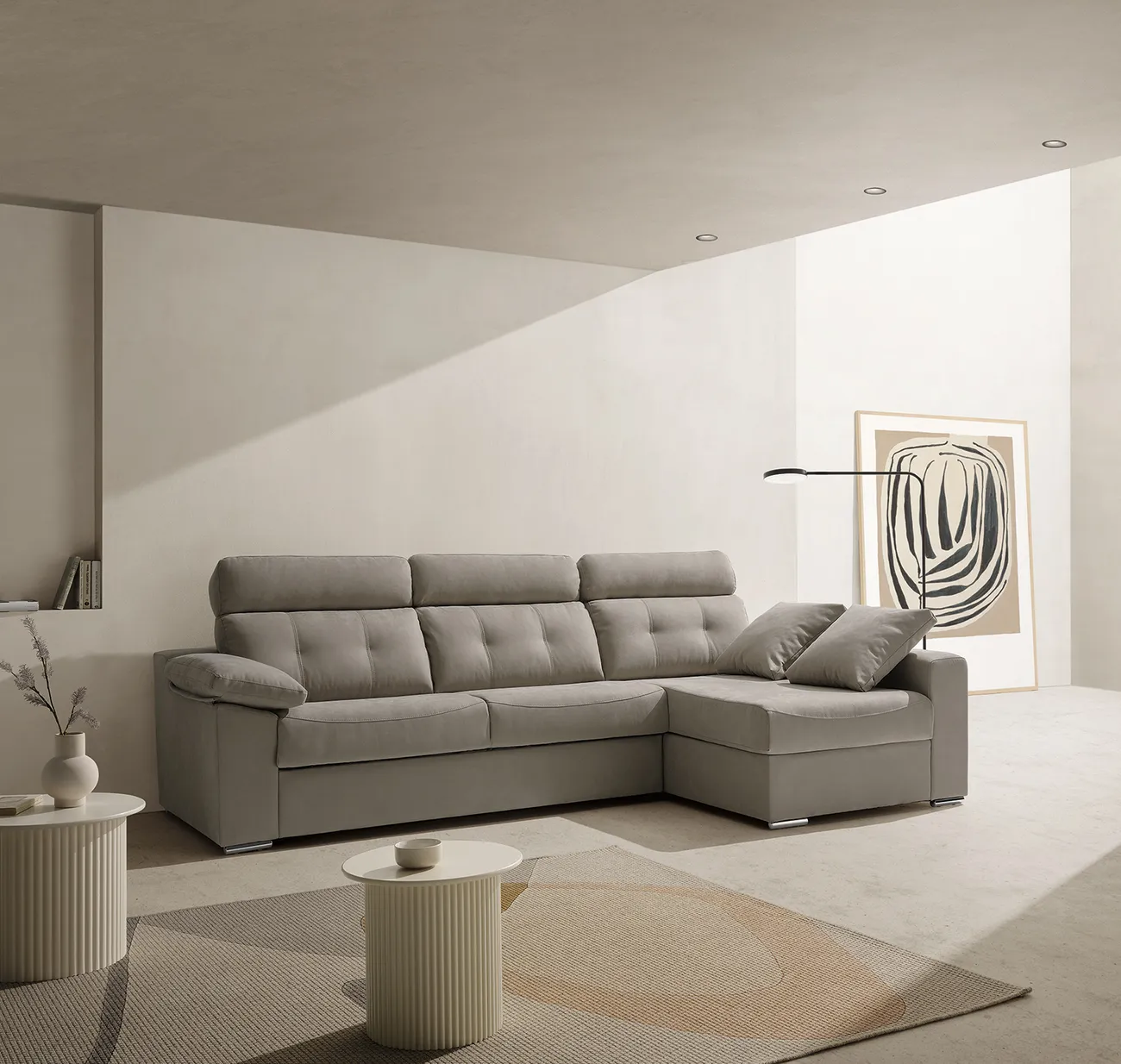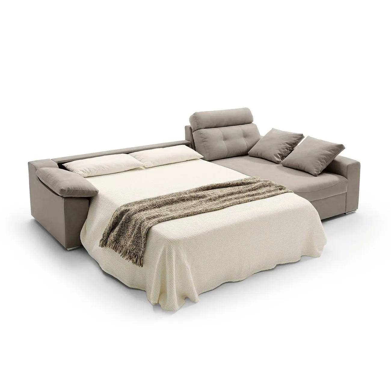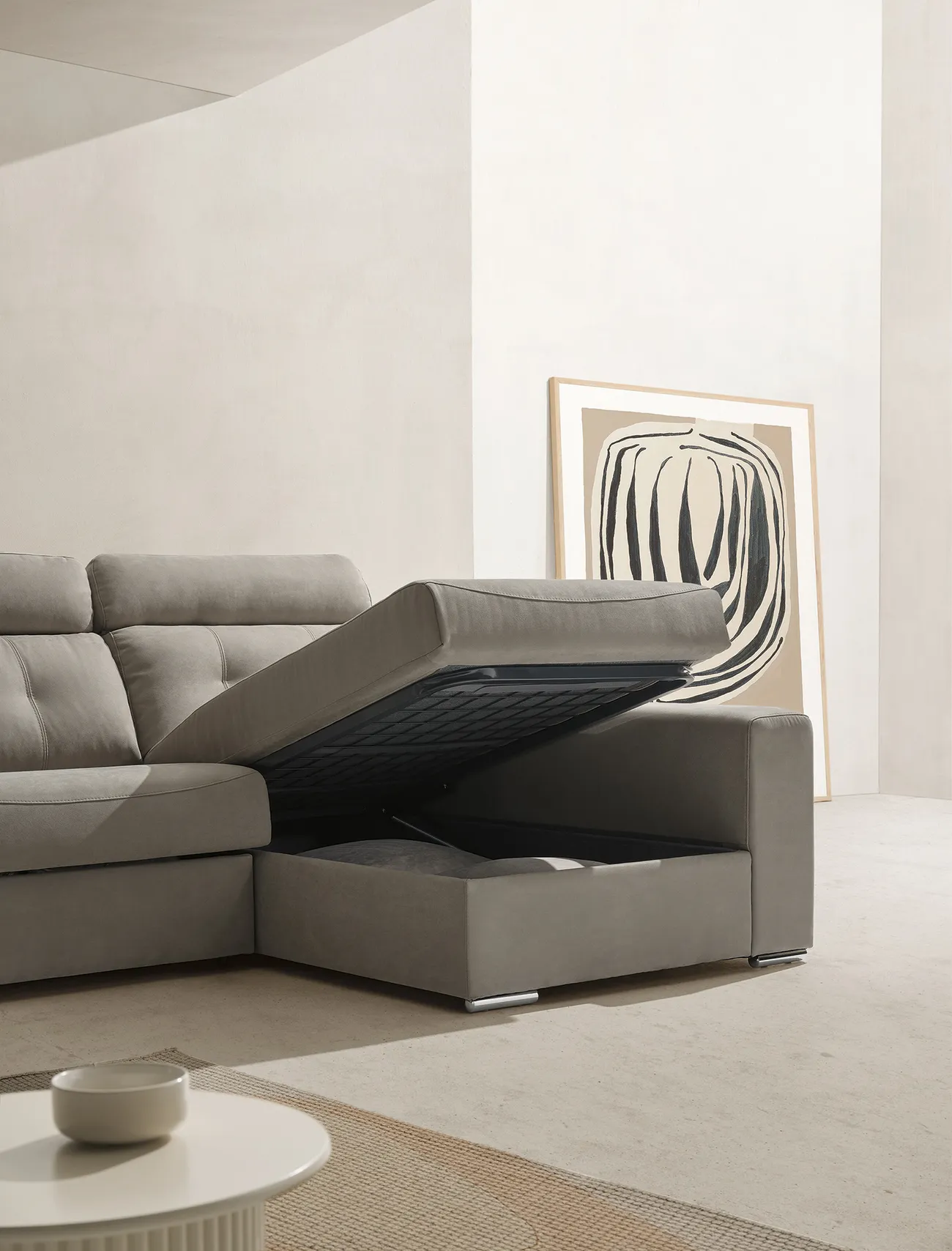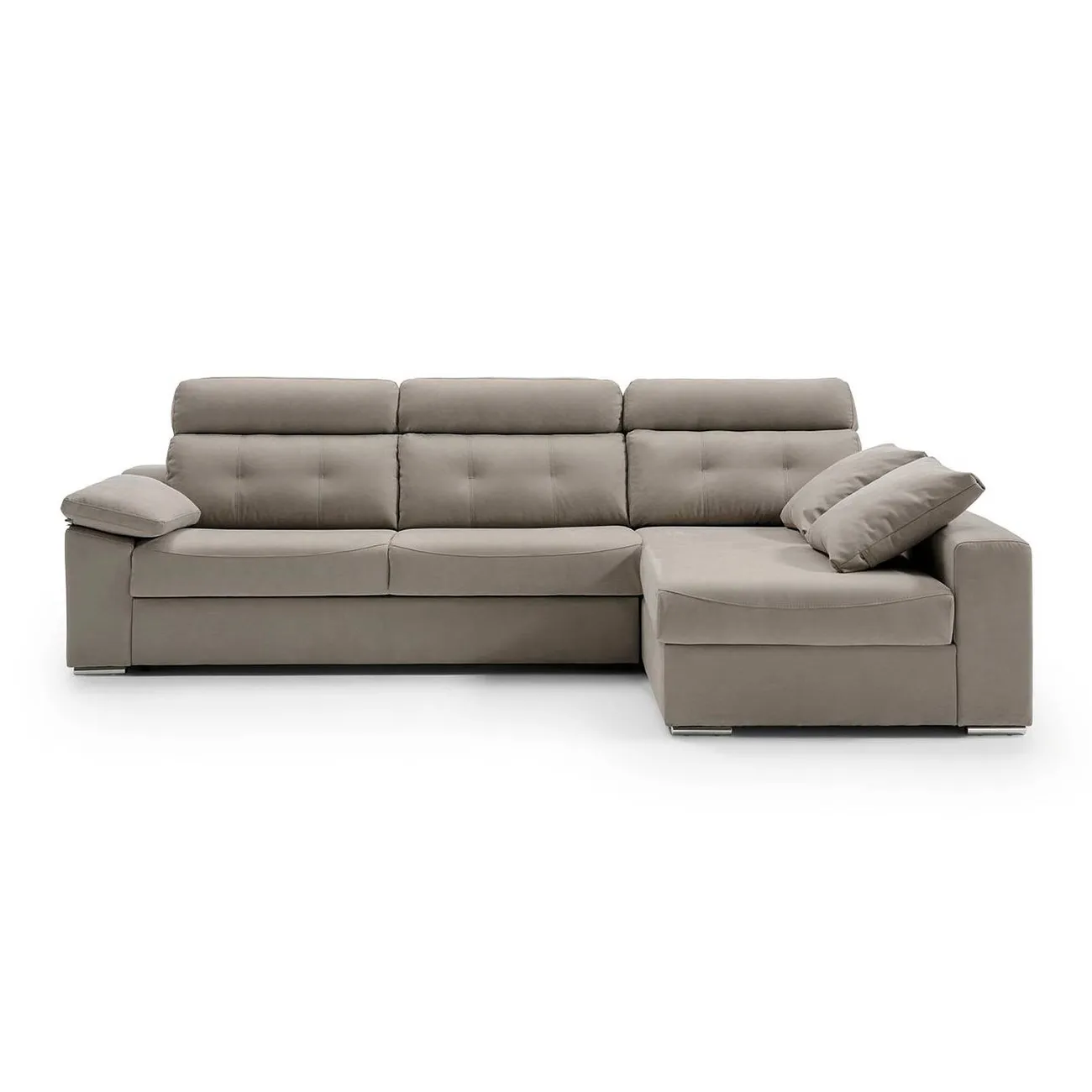 Con patas cromadas y estructura de madera de pino reforzada, mantiene el mismo aspecto cuidado que la versión sin chaiselongue. Si necesitas un sofá cama con espacio de sobra para sentarte, dormir y guardar cosas, este modelo lo reúne todo.